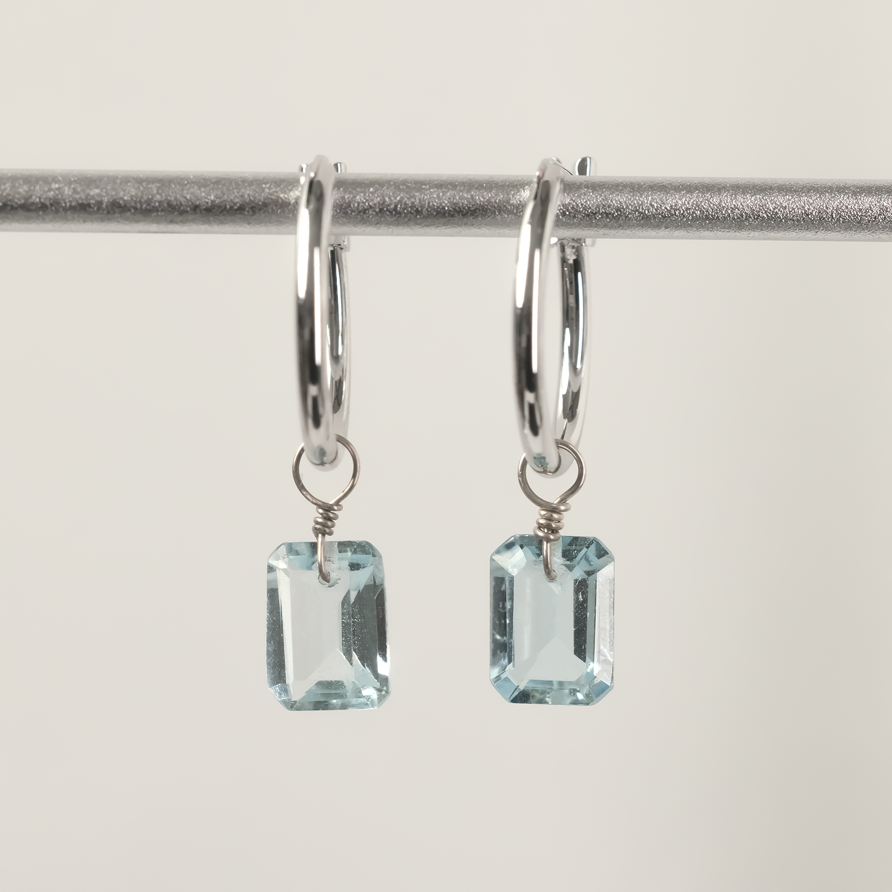 Blue Topaz Emerald Cut Rhodium Hoop Earrings