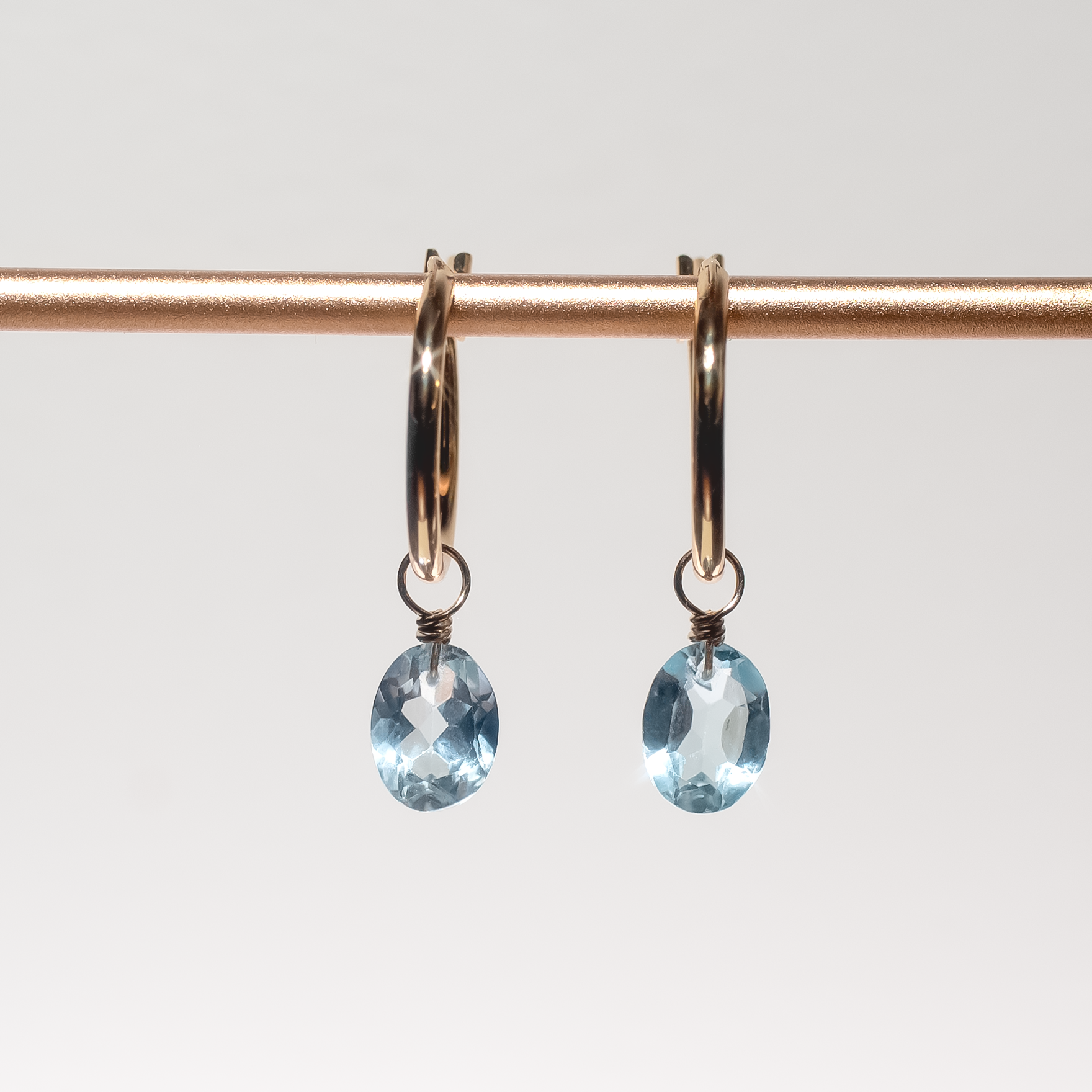 Sky blue topaz sparkles vibrantly with icy blue tones. Faceted oval cushion cut is one of the most flattering shapes. Elegant and delicate gently sway on slender hoop earrings, perfect for daily wear.