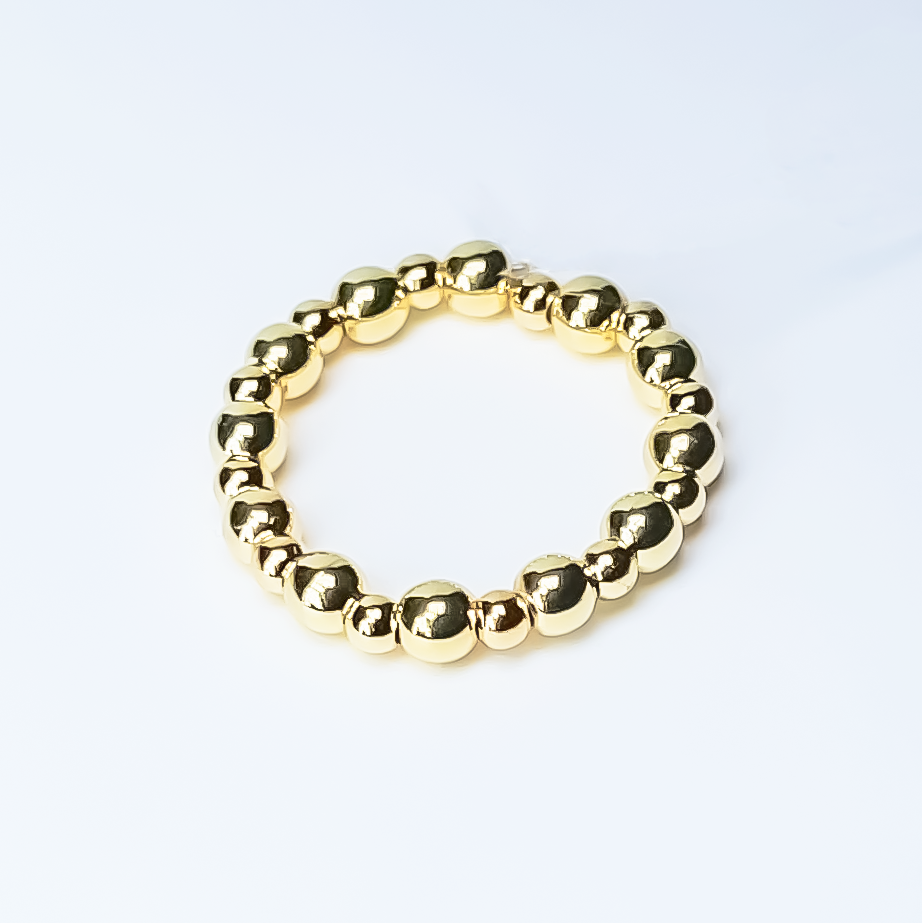 Elevate your style with this 14k Gold-filled ring featuring a stunning mix of small and large beads. The unique design exudes luxury and sophistication, surpassing traditional beaded rings. Enhanced with double strands of durable, high tensile strength cord for added strength and comfort.