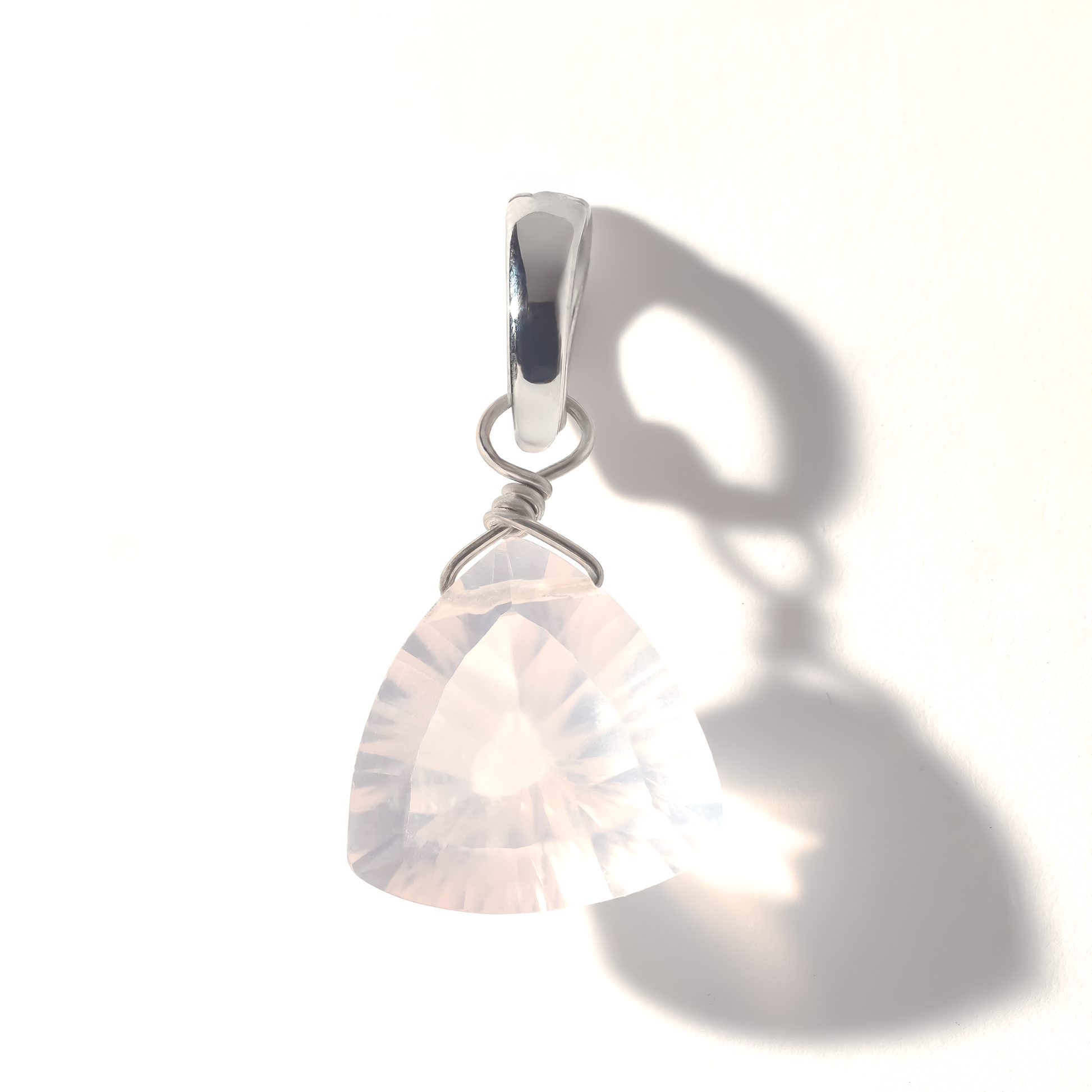 Radiant and delicate with a subtle opaque milky pink hue, this Rose Quartz Trillion Duet Charm exudes calming, affectionate energy.