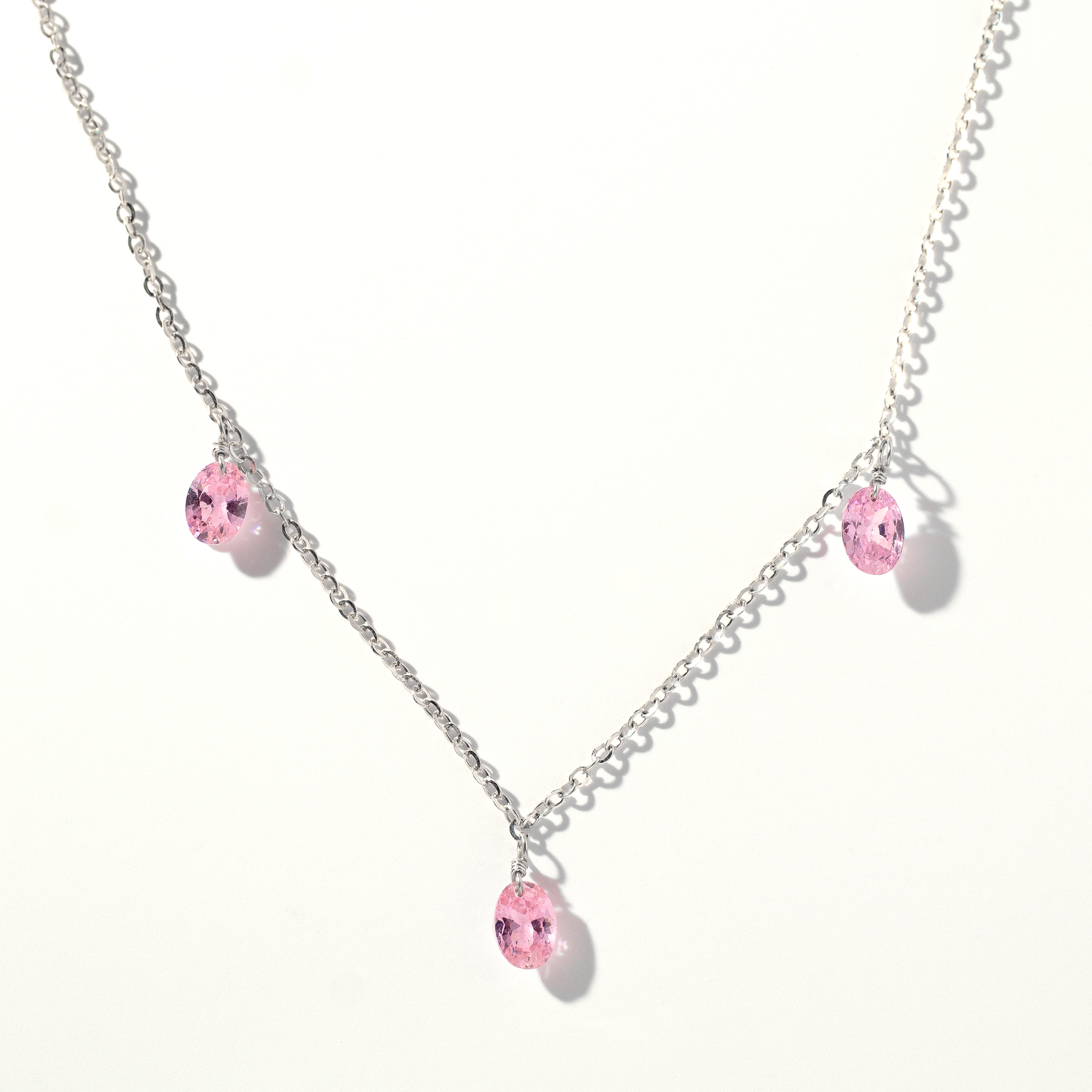 Jewels fit for a princess! Sparkling Pink Topaz oval cut gemstones twinkle across a delicate ultra fine sterling silver chain. The warm pink tones suits all skintones.