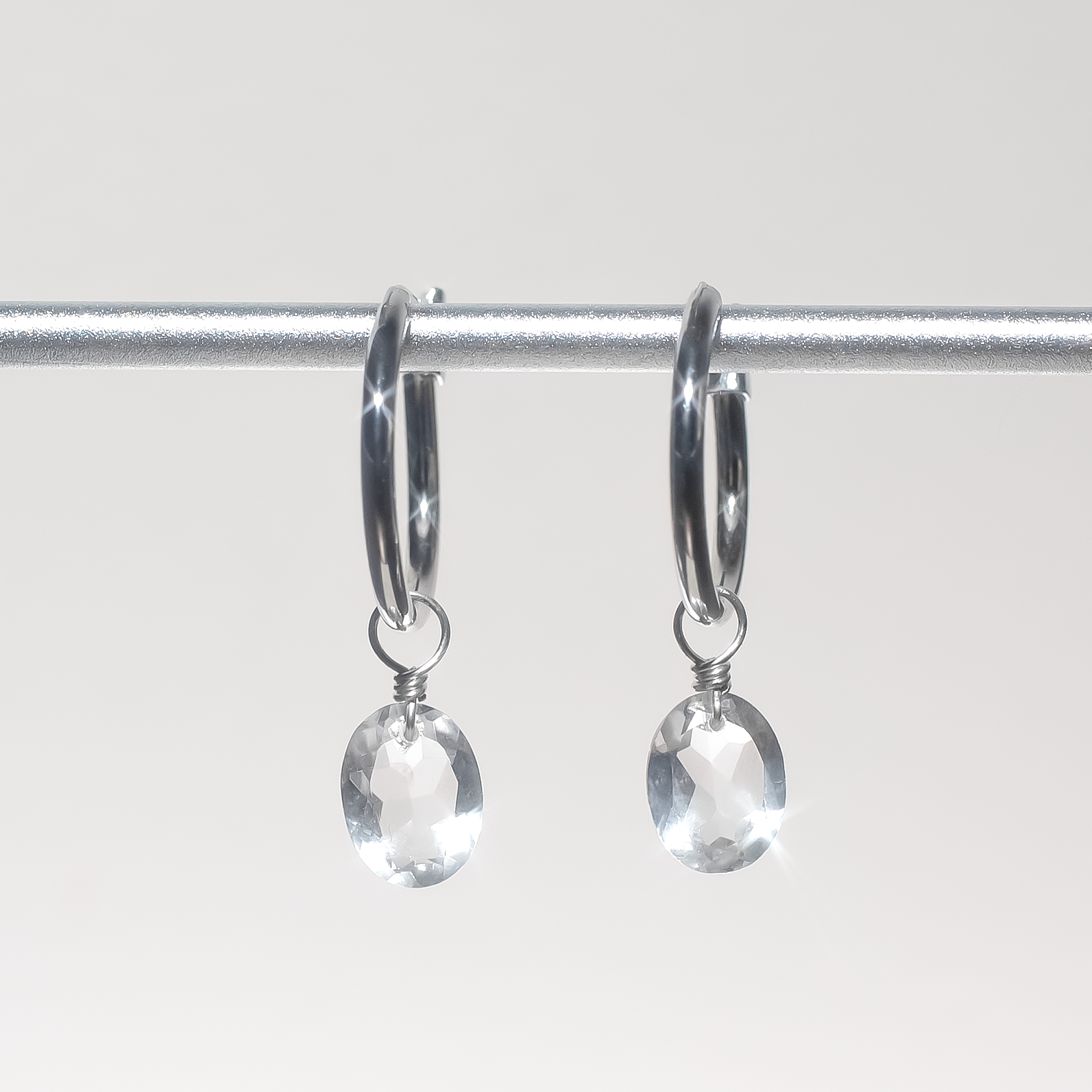 Sparkling icy Rock Crystal is luminous and brightens the wearer. Faceted oval cushion cut is one of the most flattering shapes. Elegant and delicate gently sway on slender hoop earrings, perfect for daily wear.