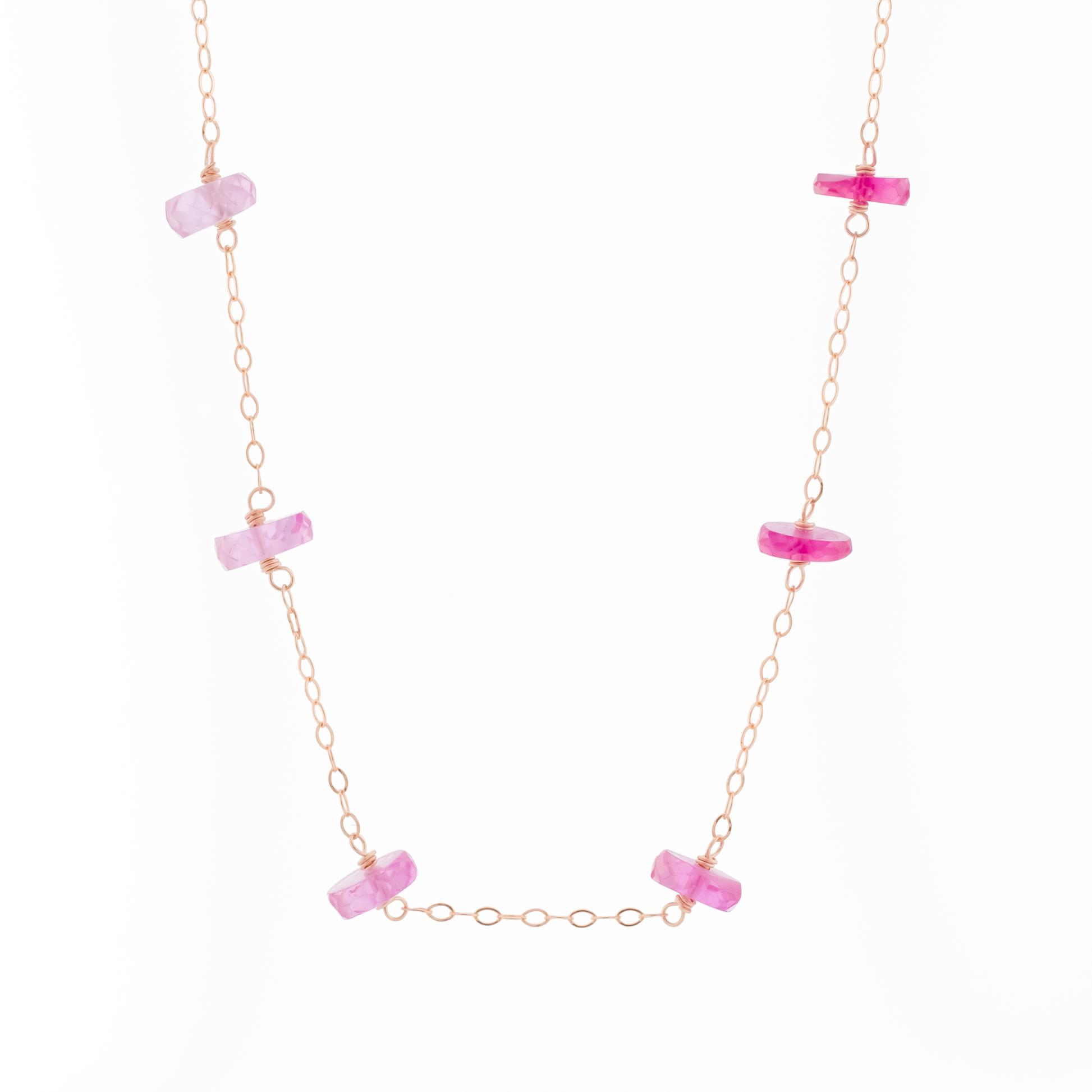 Breathtaking baby pink sapphires sparkle across a delicate 14k gold-filled chain in a ombre gradient fashion. Ripened berry pink to soft baby pink tones are incredibly mesmerizing.